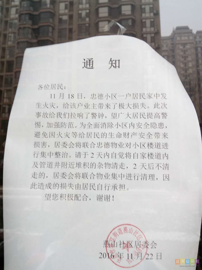 无独有偶,据市民爆料,11月18日,在忠德小区也曾发生火灾,为确保居民安全,预防火灾,燕山社区居委会督促居民对楼道杂物进行了清理。
