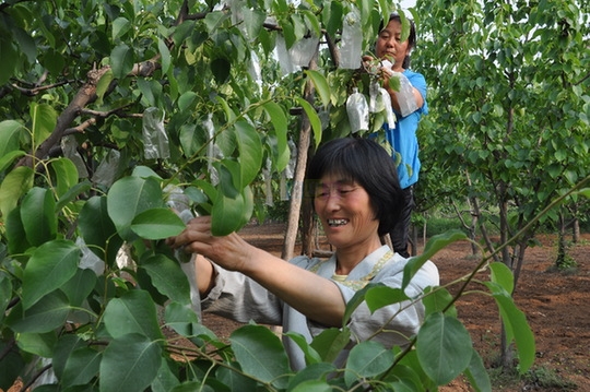 图为5月22日太平庄乡尚庄村村民梨树套袋现场