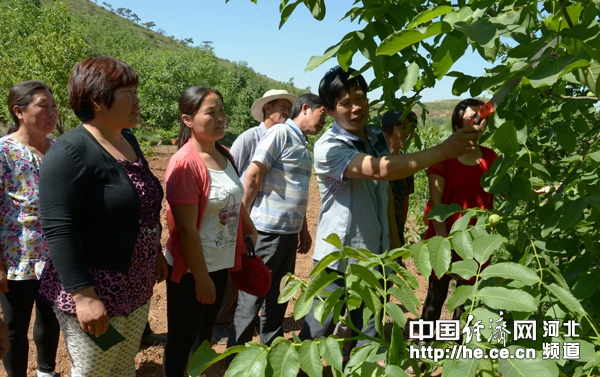 图为迁安市太平庄乡成教中心林果教师林国旺正在给该乡东山村村民讲解核桃树管理知识。