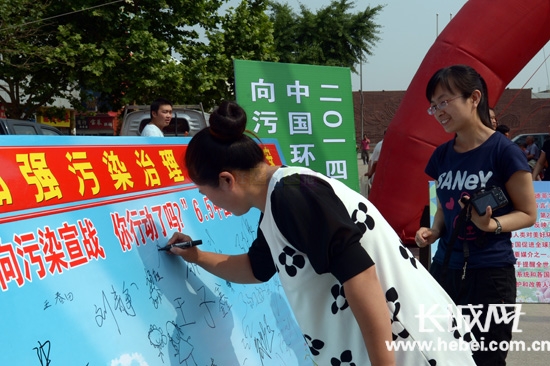 活动现场,各部门向过往市民共发放宣传彩页18000余张、环保知识宣传册2000余册、环保购物袋1500余个,悬挂环保宣传条幅7条,陈列看板28个,并组织以“向污染宣战”为主题的环保签名活动。