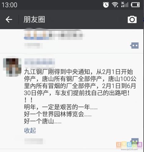 迁安信息港消息(编辑:李娜)钢铁行业遭遇寒冬,一些钢厂出现停产、拖欠工资的情况,工人们的生活入不敷出,然而近日,又有一则消息传出,称“九江钢厂刚得到中央通知,从2月1日开始停产,唐山所有钢厂全部停产”,这则消息让以钢铁为生的迁安市民们人心惶惶。