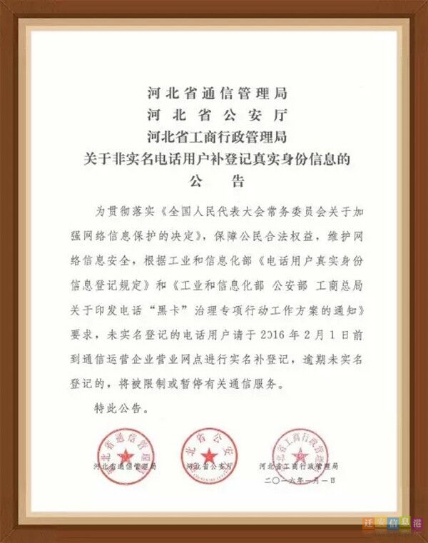 据了解,为进一步解决我省电话用户实名登记率解决未实名老用户补登记缓慢、补登记难度大的问题,河北省通信管理局、河北省公安厅、河北省工商行政管理局联合印发《关于非实名电话用户补登记真实身份信息的公告》,公告规定,未实名登记的用户应在2月1日前到通信运营企业营业网点办理实名补登记手续,逾期未实名登记的,将依据国家的有关规定,限制或暂停其有关通信服务。