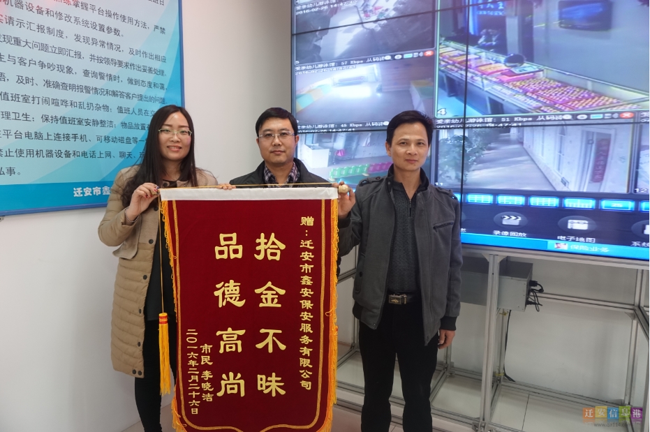 今日,李晓洁为表达感谢,特意为迁安市鑫安保安服务有限公司送来了锦旗,保安公司的领导说:这都是我们分内的事情,我们的职责就是为人民的生命、财产安全保驾护航。