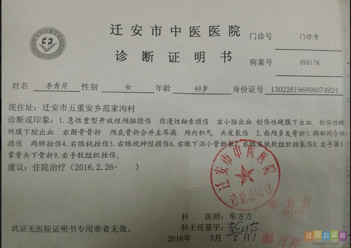 2月26日晚,在在水一方洗浴城工作的李秀芹早早完成了手头的工作,迫切的想回家给儿子李金华做一顿香喷喷的饺子,因为儿子明天就要返校了,但是,回家的途中不幸发生了,李秀芹在骑摩托行驶到马兰社区门口时被一辆由北向南而来左转的轿车撞倒了,后送进迁安市中医医院抢救治疗,从2月26日晚上至3月4日,已经在ICU重症监护室内治疗观察了一周的时间,由于撞击导致头部与肺部严重受损,一直处于昏迷不醒状态,病情严重。