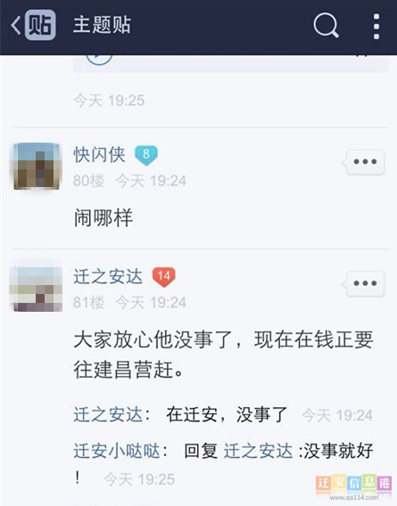 据了解,曾先生发帖之后,就有吧友不断回帖,规劝曾先生放弃轻生的念头,赶紧回家。吧友“迁之安达”当时并不在迁安,看到帖子之后,立即号召附近的吧友赶紧到人工湖附近看一下,尽量阻止悲剧的发生,也有吧友在焦急之中拨通了110,希望警方能尽快到场。最终在吧友热情、及时的规劝之下,曾先生放弃轻生念头,从迁安回到建昌营家中。