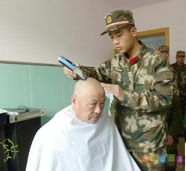 在光荣院,武警官兵为老人们打扫院子、量血压、理发,忙的不亦乐乎。温馨祥和的氛围中,刚毅的武警汉子化身贴心的后辈,关心着院里老人的生活起居和饮食情况、聆听前辈们讲述参加革命的峥嵘岁月,场面十分温馨。
