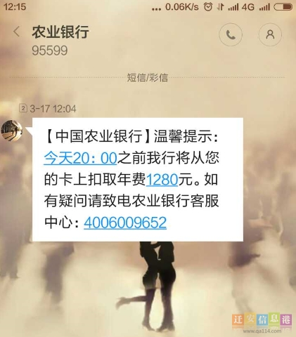 迁安信息港消息(编辑:李娜)今日,迁安市热心市民王女士(化名)向迁安信息港爆料称,“今天我的手机上收到农业银行95599短信,要扣取年费1280元”,让这位市民更为心惊的是,她的家人手机上也陆续接到相同内容的短信。这究竟是真是假?扣年费要扣1280元?农业银行也太狠了!