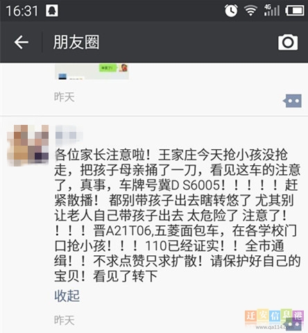 小编从热心市民发来的消息中看到,这条微信的内容是:“各位家长注意啦!大王庄今天抢小孩没抢走,把孩子母亲捅了一刀,看见这车的注意了,真事,车牌号冀D S6005!赶紧散播!都别带孩子出去瞎转悠了,尤其别让老人自己带孩子出去。太危险了,注意了!晋A21T06,五菱面包车,在各学校门口抢小孩!110已经证实!全市通缉!不求点赞只求扩散!请保护好自己的宝贝!看见了转下”。