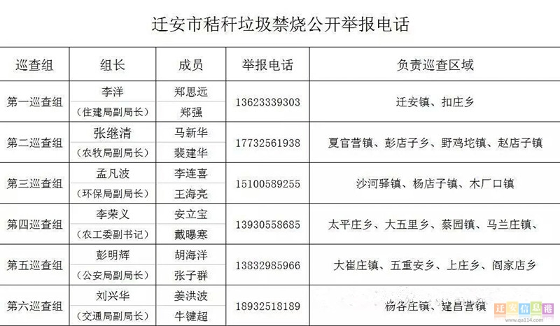 迁安信息港消息(编辑:李娜)近日,小编从迁安市农工委获悉,为响应唐山市于3月15日下发的《唐山市秸秆垃圾焚烧管理办法(暂行)》的通知,为保障全市禁烧秸秆、垃圾工作的全面有效开展,市农工委公布了各巡查组举报电话。