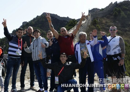 3月30日,130余名在迁安市参加2016年里约奥运会拳击项目亚大区资格赛的外国运动员和教练员,利用休赛时间来到该市白羊峪长城参观,体验长城文化。图为外国运动员在白羊峪长城上合影留念。