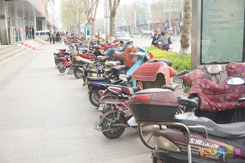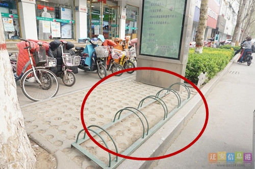 在迁安的大街上,人行道变“停车场”的现象随处可见。在燕山大路与惠宁大街交叉口处东南角和西南角的手机店和银行门口均被车辆堵的严严实实,如果有行人想要在此通过,只能另寻出路,绕道而行。而且,很多店铺门口,都被自行车或者电动车占去一半的路面,路边的卡位式自行车停车架却形同摆设,无人使用,不但给正常行人带来很大的不便,挡住盲道也给盲人造成很大的安全隐患。