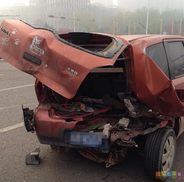 接到消息,小编立即赶往事故现场,到现场后发现,只有一辆尾部严重受损的橘红色小汽车,只见这辆橘红色小轿车后备箱门被撞的高高翘起,后保险杠已是“面目全非”,右后侧车胎也是完全“裸露”在了外面,见到受损这么严重的小汽车,小编产生了疑问,为什么现场只有这一辆汽车?其他的肇事车辆哪里去了?