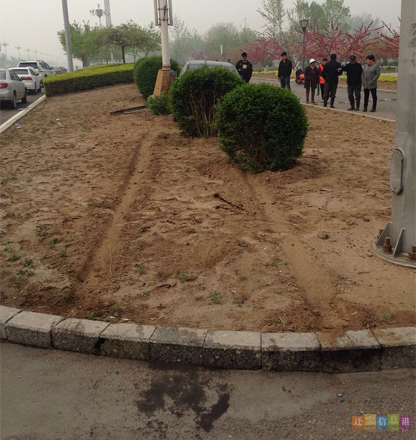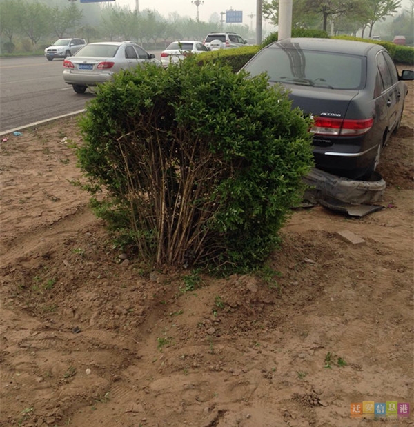 带着这个疑问,小编询问了在一旁围观的环卫工人,环卫工人用手指了指对面的绿化带,小编这才看到一辆黑色的小轿车停在对面的绿化带里,就现场的情况来看,这辆黑色小轿车应该是冲上绿化带后,连续压过两个球柏后,直到撞上了路灯杆后才停下。