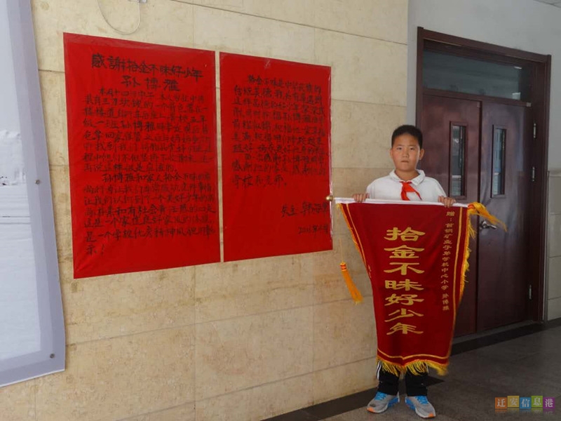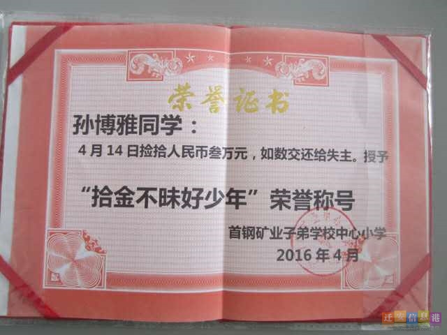 据了解,2016年4月14日下午6点,12岁男孩孙博雅回家时在一楼楼道捡到一个蓝色背包,当发现包里有3万元巨款时,孙博雅坚持在原地等待近一个小时之久,最终在邻居和妈妈的帮助下,孙博雅联系到失主,并将钱款物品如数归还失主。孙博雅的这一举动让失主感动,失主为表示感谢,于4月20日下午,为他所就读的首钢矿业子弟学校中心小学送来了锦旗和一封感谢信。