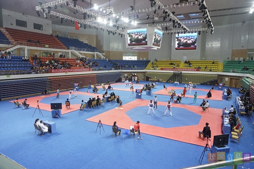 今日上午进行了男子54公斤级、男子58公斤级、女子46公斤级、男子54公斤级比赛,比赛现场非常激烈,每当选手得分时,现场都会响起阵阵掌声,参赛选手的队友也齐声呐喊,为比赛中的选手加油助威。