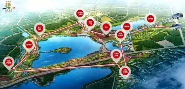“一轴”为主景观轴,由北向南依次布局综合展示中心、丹凤朝阳广场、水上剧场、驳船码头、龙山、植物风情园等11处主要景观节点;