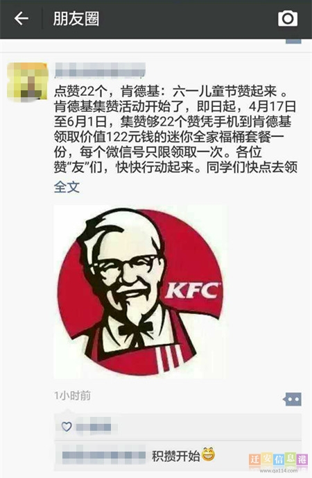 “肯德基集赞活动开始了,即日起,4月17日至6月1日,集够22个赞,凭手机到肯德基领取价值122元钱的迷你全家福桶套餐一份,每个微信号只限领取一次,各位赞友们,快快动起来”。近日,小编在朋友圈看到这样一条集赞活动,经小编与好友沟通得知,“现在朋友圈都是这条消息,我看他们都在转发,也就转发了”,看到被此条消息刷爆的朋友圈,小编的朋友也开始了“集赞”活动。“我也不知道这条消息来源是哪里,只是看起来像真的就转发了”,小编经向几位转发此消息的几位微信朋友询问得知,他们也并不清楚消息的来源。