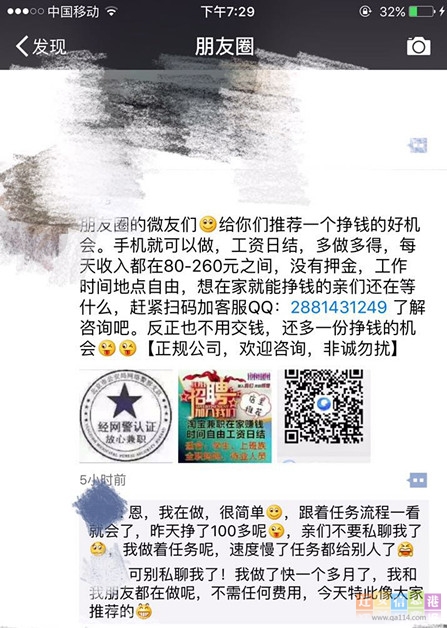 据小丽介绍,近几天,她看到同学在朋友圈里转发的“挣钱”方式:“手机就可以做,工资日结,多做多得,每天收入都在80—260元之间,没有押金,工作地点自由,反正也不用交钱,还多一份挣钱的机会”,最后以“正规公司,欢迎咨询,非诚勿扰”为结局,让小丽动了心。