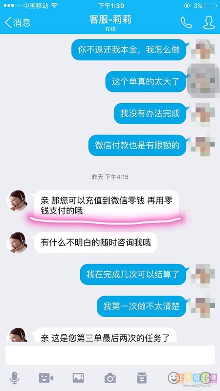 小丽首先加了客服QQ了解情况,在与客服-莉莉进行聊天之后,小丽成功申请双重任务,于是利用照顾孩子的闲暇之余刷单,在小丽前前后后垫付了10780元之后,小丽称,她已经没有钱继续投入本金了,要求客服莉莉将本金退回,然而客服莉莉则以“小丽没有按要求完成任务”为由,不予退还本金和佣金,而且还要求小丽再完成10780元的任务以后才能退款,这个意思是说,小丽还需再垫付10780元才能退还小丽的本金和佣金。
