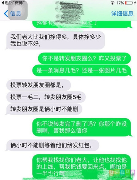 经询问了解到,原来小丽的同学是通过转发兼职淘宝刷单赚钱的信息到朋友圈来赚钱的,据了解,转发一条这样的信息赚5角,投票1.2角,转发朋友圈需保留信息两个小时不得删除。而不知所以的小丽就是通过这条“害人”的朋友圈信息而上当受骗,被骗去了10780元。