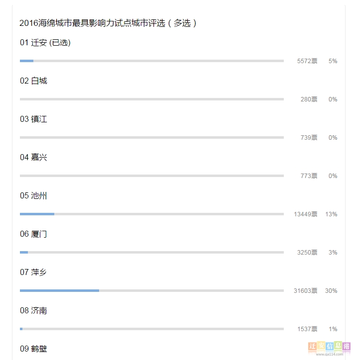 迁安信息港消息(编辑:李娜)近日,2016年海绵城市最具影响力试点城市评选活动正在进行中,在此,小编将投票方式公布如下,希望广大市民能积极参与,为大迁安投上宝贵的一票,截止至今日下午五点,迁安共获得5572票,位于第五名。