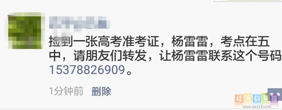 迁安信息港消息(编辑:李贺娟)一年一度的高考即将开锣,如果哪位考生在考试前夕丢了准考证,肯定会心急如焚。今日,小编得到热心市民张先生爆料称,朋友圈被一则丢失准考证的消息刷屏,介于往年流传的考生丢失准考证谣传,张先生有所质疑,那么,张先生在朋友圈看到的这则消息到底是真是假呢?