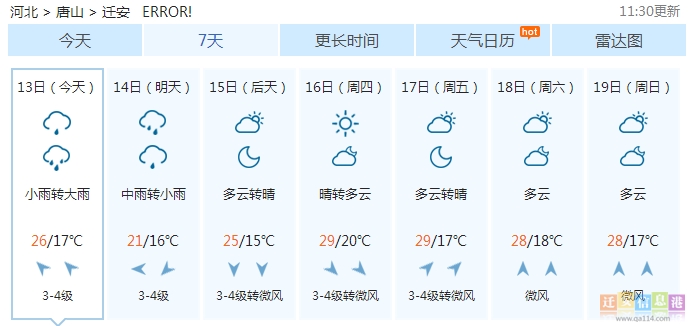 随后,小编从中国天气网上获悉,13日傍晚至14日迁安将有明显降雨过程,13日小雨转大雨,14日中雨转小雨,在此,小编提醒广大市民做好准备,学校、幼儿园应采取适当措施,保证学生和幼儿安全;司机朋友应注意道路积水和交通阻塞,确保安全。
