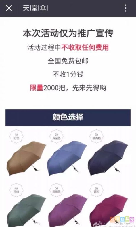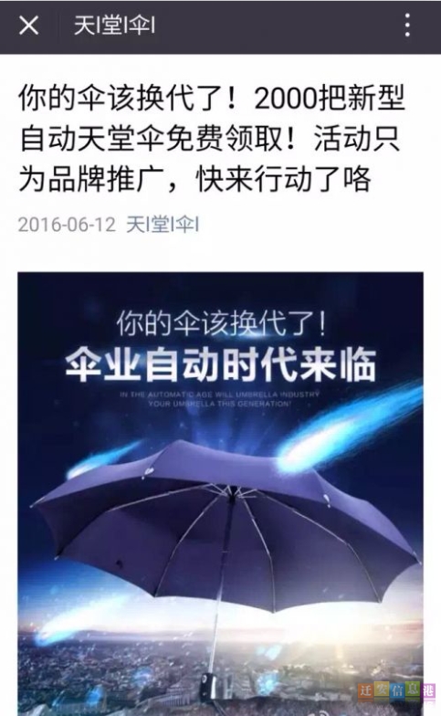 小编在朋友圈里看到由微信公众号为“天|堂|伞”发布的如下内容:“你的伞该换代了!2000把新型自动天堂伞免费领取!活动只为品牌宣传,过程中不收取任何费用,全国免费包邮,不收一分钱,限量2000把……”这条消息在微信朋友圈里被疯狂转发。