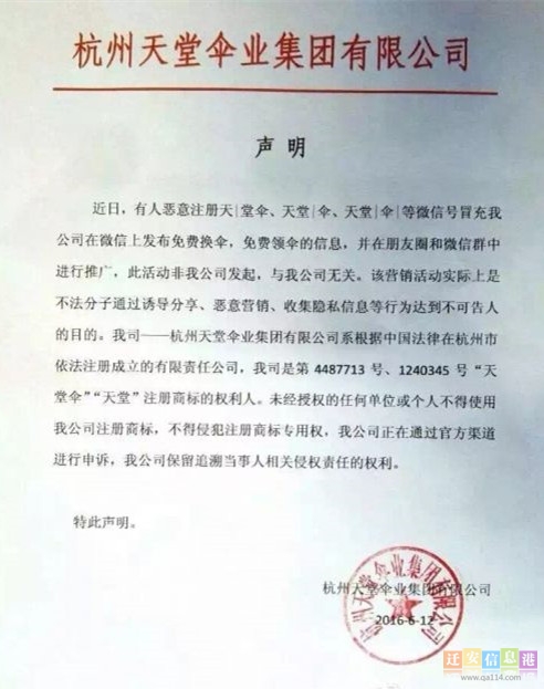 随后,小编在杭州天堂伞业集团有限公司发布的声明中了解到,该公司并没有举办所谓的“天堂伞免费送”的活动。