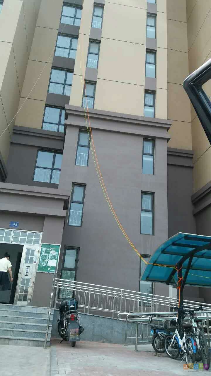 得到市民爆料之后,小编实地走访了荷风御景小区,在居民反映的四号楼一单元楼前,小编看到几根长长的电线从高高的楼上垂下来,五层楼上垂下来两根线,八层楼垂下来一根,还有从十几层楼上垂下一根,最长的一根电线大约有三四十米。