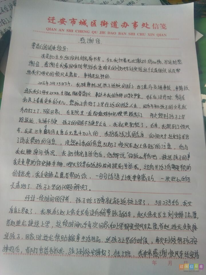 做完手术后,郭书军躺在病床上看着受伤的女儿,开始为女儿往返学校的事情发愁。因路途较远,而且孩子的腿尚未痊愈,不方便坐公交车,正当此时,郭书军想到去年9月份她偶然加入的顺风车迁安站。抱着试试看的态度,她向顺风车迁安站发出求助信息。
