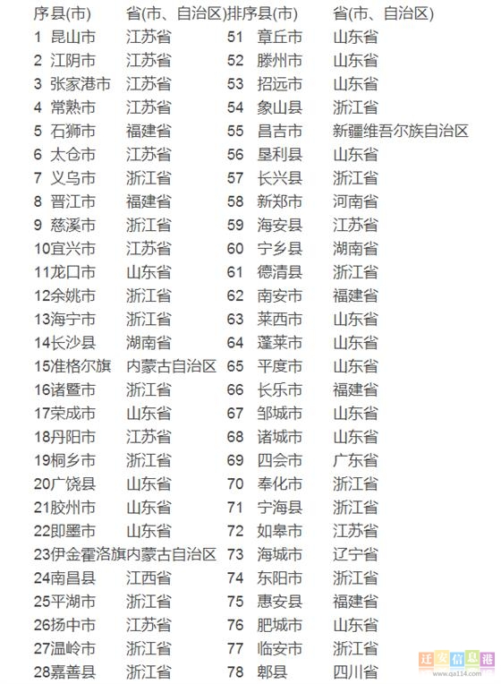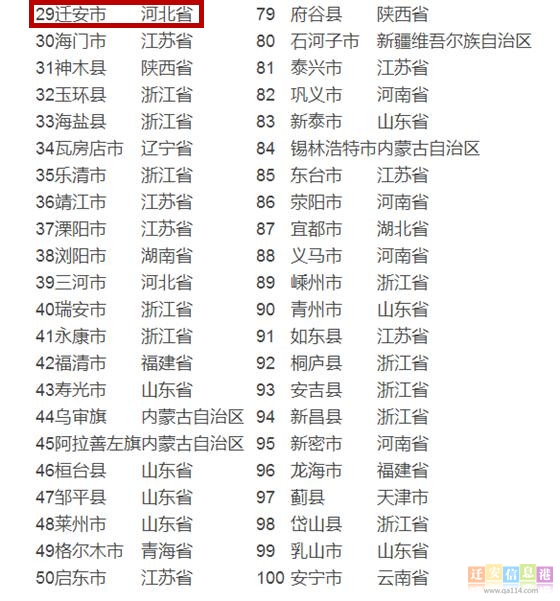 据了解,赛迪研究院对全国将近3000个县(市)进行综合评估,发布了“县域经济100强”。榜单前4位均被江苏省包揽,分别是昆山市、江阴市、张家港市、常熟市;河北省共有迁安市、三河市两市上榜,其中迁安市排名第29位,三河市排名39名。