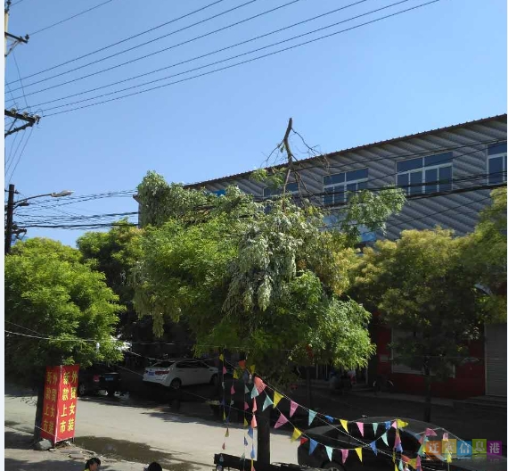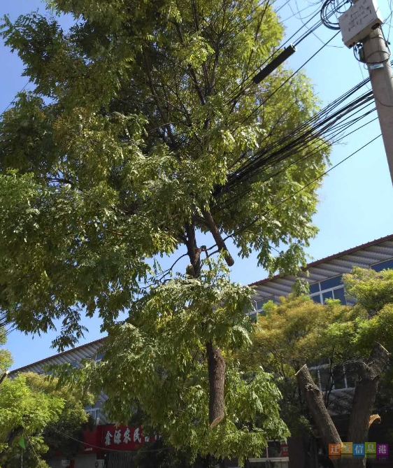 据柴先生讲述这几棵树长在街旁非常茂盛,居民们经常在树下乘凉。但今天早上7点左右柴先生从家出来发现几棵树不知被谁砍断了,更可怕的是树冠还挂在通信光缆上,风一吹,摇摇欲坠。柴先生介绍,树南边就是幼儿园,还好是暑假,幼儿园已经放假了,但这条街是主街道,路过的行人还是很多的,几棵树冠挂在线上非常危险。
