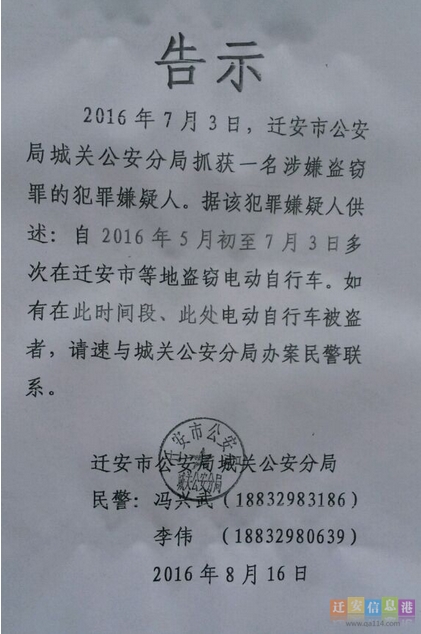 迁安信息港消息:近日,有市民向本平台爆料,称市城关分局张贴了一张关于抓获偷盗电动自行车犯罪嫌疑人的告示。