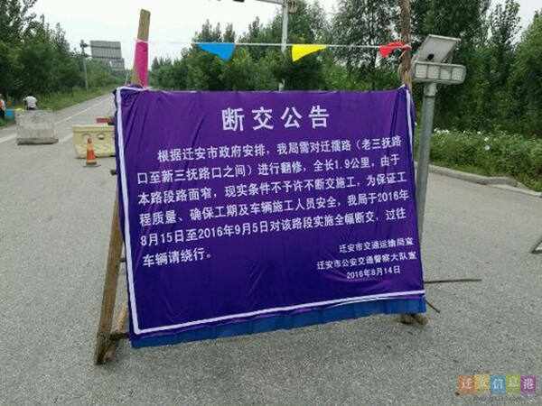 迁安信息港消息:今日,小编看到网友发布信息称,因路面翻修,迁擂路(老三抚路口至新三抚路口之间)自8月15日开始断交,需要绕行。