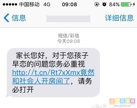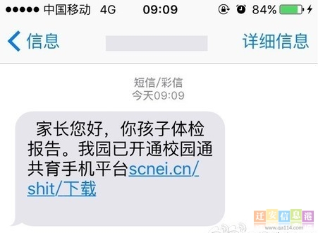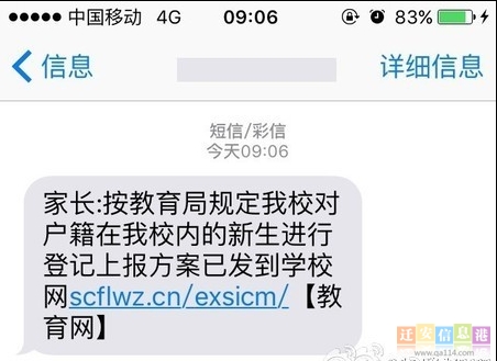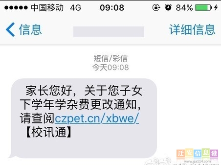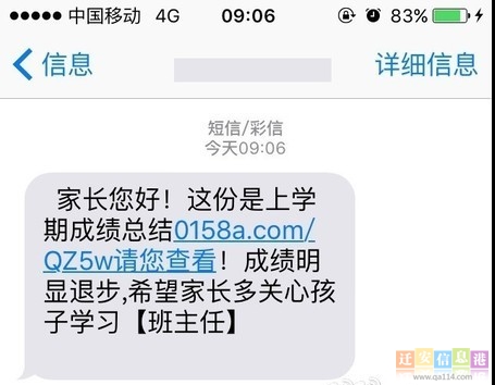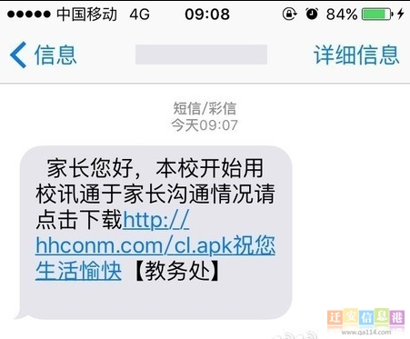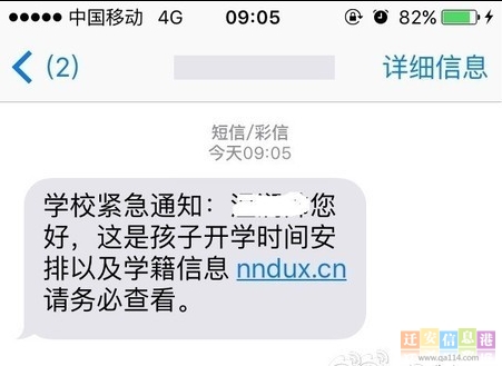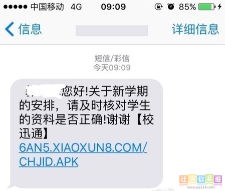 迁安信息港消息:前段时间徐玉玉被骗猝死事件,让人们在为徐玉玉深感惋惜的同时,也对骗子恨之入骨。如何防止上当受骗,避免遭受经济损失也成为广大市民关心的问题。近日,家住迁安市区的张女士向信息港爆料称,她收到一条疑似校讯通的信息,怀疑是诈骗短信,她并没有点击链接。希望信息港能提醒广大市民朋友提高警惕,小心上当受骗。