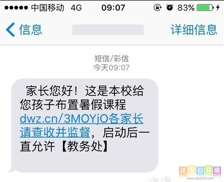 在此,小编提醒广大市民,尤其是家长朋友,收到类似不明号码发来的短信时一定要注意甄别,别因一时的疏忽大意,而导致财产损失。(编辑:李娜)