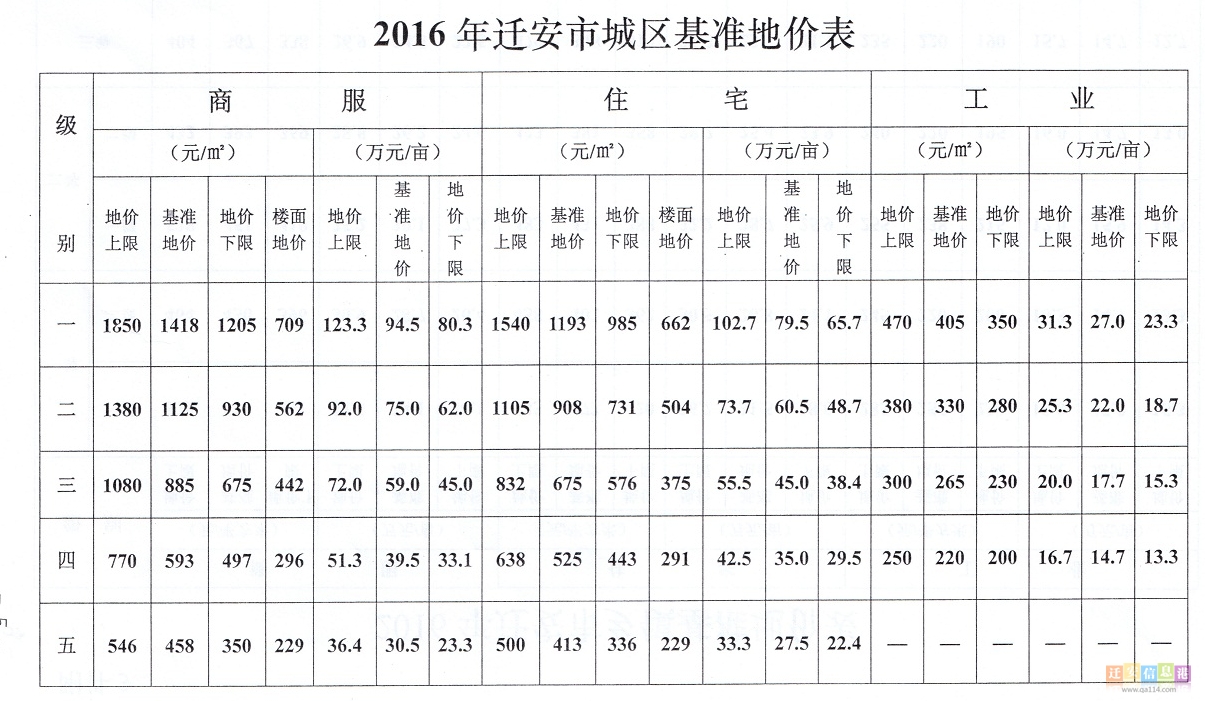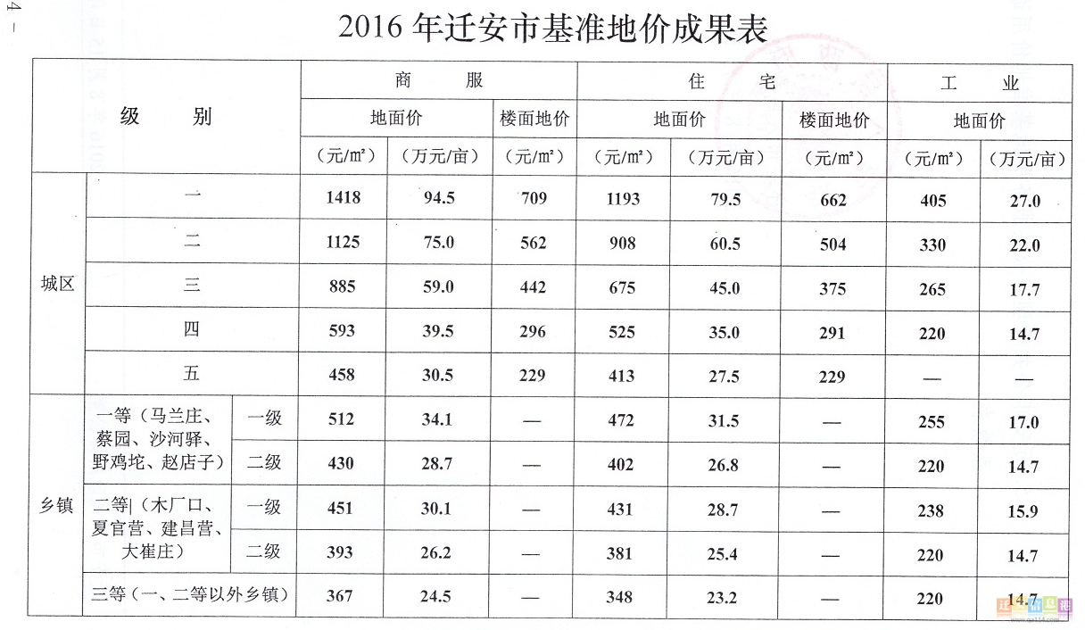 为适应经济社会发展需求,加强土地资产管理,根据《河北省国土资源厅办公室转发国土资源部办公厅关于实施城镇土地分等定级规程和城镇土地估价规程有关问题的通知》(冀国土资办发[2015]47号)和《河北省国土资源厅办公室关于印发河北省城镇土地定级与基准地价评估技术指南(试行)的通知》(冀国土资办发[2016]19号)要求,迁安市启动了土地级别调整、基准地价更新工作。土地级别按照商服、住宅和工业三种用途分类定级,商服、住宅均划分为5个级别,工业划分为4个级别(公共管理与公共服务用地级别对应参照执行)。受整体经济下行影响,商服用地、住宅用地高级别基准地价有所下降。受征地成本增加影响,工业用地基准地价平均提高了24.25%