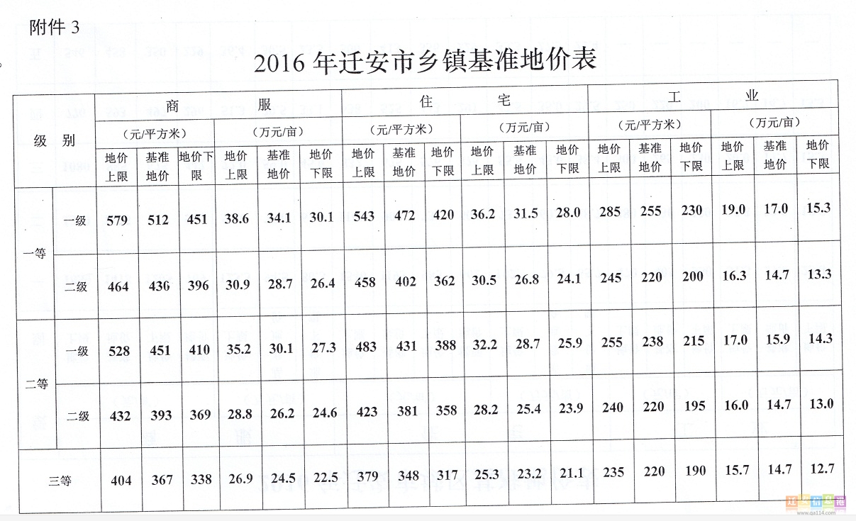 乡镇基准地价内涵为:期日为2016年1月1日,法定最高出让年限(商服40年,住宅70年,工业50年),土地开发程度商服、住宅、工业均为宗地红线外“五通”(通路、通电、通讯、供水、排水)及宗地红线内场地平整,平均容积率为商服1.5,住宅1.5,工业1.0。