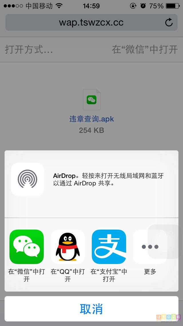 据蔡先生讲述,今天上午,他开车到市区办事,在回来的路上就收到了违章短信。蔡先生仔细回忆了下,今天并没有违章行为,怎么会收到违章信息了呢?再仔细一看短信,发现短信中有下载APP的链接,心中有些疑问,但短信署名为“唐山交警”,蔡先生还是决定点开链接看看。可链接一点开就提示要选择打开方式,提供的选项有微信、QQ、支付宝,全是与支付方式相关的,出于警惕蔡先生没有进行下一步动作。