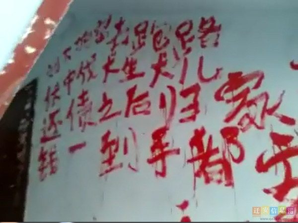 迁安信息港消息:单元楼的楼道内和外墙,被喷上红漆,写满“讨债”、“还钱”的字眼,甚至单元楼外的路面上,都未能幸免。电影中的桥段发生在了现实生活中,这让楼内的居民很是忧心。