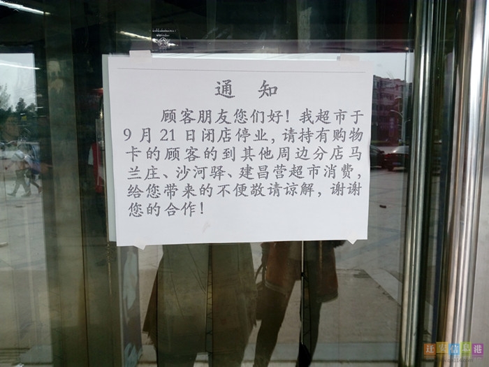 今日上午十点左右,小编来到迁安市阜安大路金客隆店,发现超市确实已经闭店关门。门上贴着的通知称,超市于9月21日闭店停业,持有购物卡的顾客可以到马兰庄、沙河驿或建昌营等周边超市消费余额。