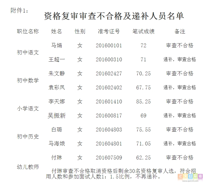 据悉,根据《关于公开招用合同制教师的公告》,此次面试按照招用人数和参加面试人数1:1.5比例进行,依据笔试成绩从高分至低分确定进入资格复审人选(末位出现并列的一同进入资格复审),审核通过的进入下一步面试程序,未通过的取消资格,比例不足的递补本岗位笔试成绩下一名考生进入资格复审,合格的进入下一程序。