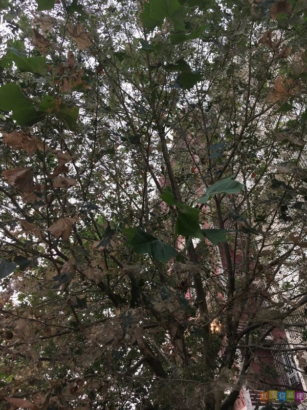 据帝景豪庭67号楼业主介绍,前不久,绿化树上出现很多毛毛虫。毛毛虫吃光了树上的叶子,并且从树上掉落下来,爬进单元楼和墙面。四处爬行、随时可能从上面掉下来的毛毛虫,让不少业主直起鸡皮疙瘩,“小区里有不少老人和孩子,前几天,毛毛虫从树上掉下来,吓哭了一个小孩,现在大家走路都非常小心。而且毛毛虫掉到身上,很有可能引起皮肤过敏,现在都不敢在外面待着了,进出门都要加快速度,”在市民提供的照片中,我们看到被毛毛虫侵害的梧桐树,只剩下光秃秃的树梗和发黄的叶脉,树枝之间结成网状,整个树冠枯黄一片,看起来不仅毫无美感,甚至让人觉得全身很不舒服。