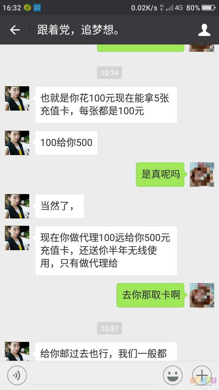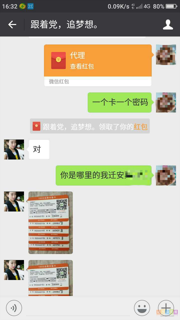 据李先生讲述,前天微信上有人加他好友,由于现在微信加好友太普遍了,李先生也没在意,立刻就同意了。之后,这个“好友”就一直给李先生发充话费的消息,消息中称:做代理可以享受100元拿五张充值卡,每张都是100元,等于花100元得500元的充值卡,然后可以40元一张卖出。开始,李先生也有所怀疑,但在跟“好友”简单沟通后,发现她说的还挺靠谱的,当即就给对方发了100元红包,准备买下5张100元的充值卡。