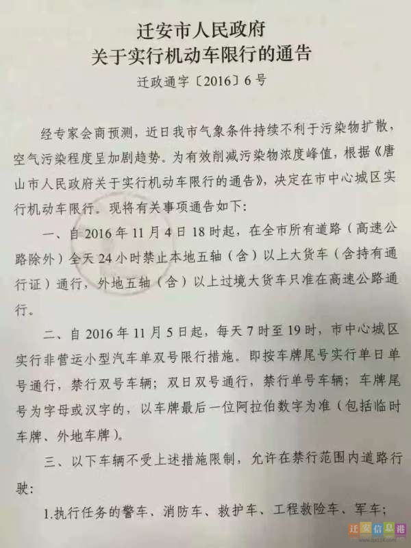 迁安信息港消息:今日,小编从相关部门获悉,为有效削减污染物浓度峰值,根据《唐山市人民政府关于实行机动车限行的通告》,明日起,将在迁安市中心城区实行机动车限行,望广大市民知晓。