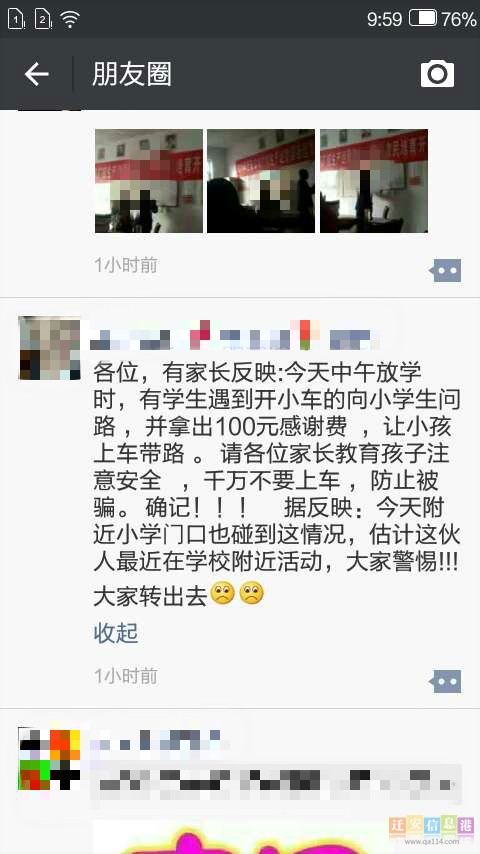 “各位,有家长反映:今天中午放学时,有学生遇到开小车的向小学生问路,并拿出100元感谢费,让小孩上车带路。请各位家长教育孩子注意安全,千万不要上车,防止被骗。 切记!!!据反映:今天附近的小学门口也碰到这情况,估计这伙人最近在学校附近活动,大家警惕!!!大家转出去。”