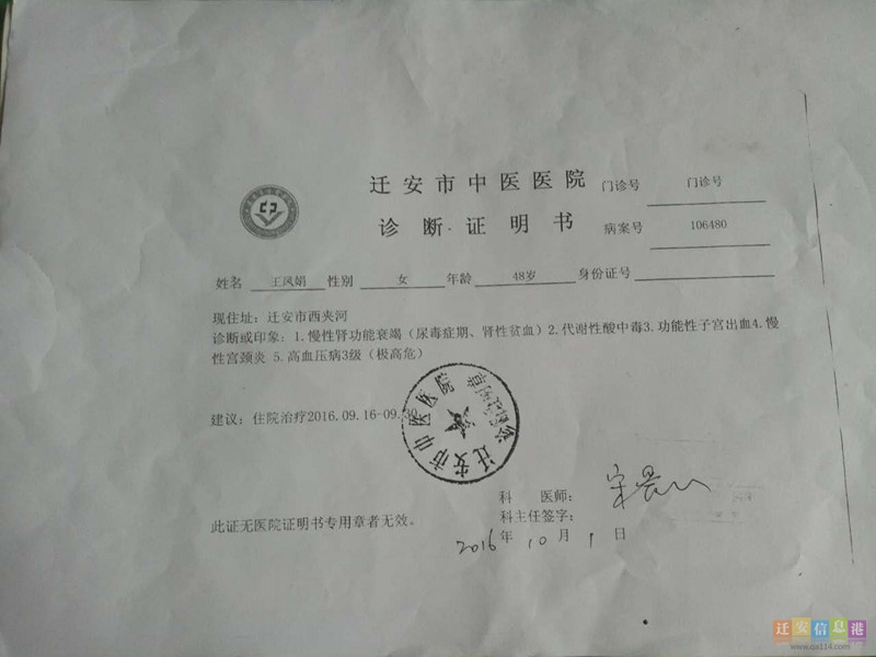 发来求助信息的是一名刚刚20岁的女孩王立安,现就读于唐山市某专科学校,家住迁安市迁安镇西夹河村。小编与王立安沟通时获悉,她的母亲王凤娟于2016年9月19日被确诊为尿毒症,在这期间前后去了多家医院,共花费4万余元,其中大部分治疗费用都是向亲戚朋友借来的。目前母亲王凤娟需要一周三次的透析治疗,已家徒四壁,难以为继。
