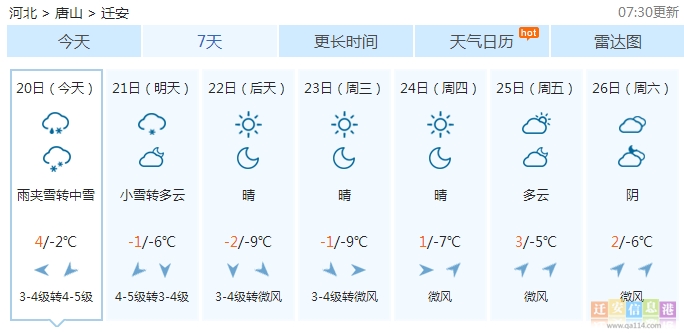 迁安信息港消息:昨晚,迁安市政府应急办发布《关于解除重污染天气橙色预警二级响应的通知》,自11月20日零时起解除我市重污染天气二级橙色预警响应,同时停止执行机动车限行措施。但是从今日起,寒潮来袭,温度骤降,今明两天将迎今冬首场降雪,在此,小编提醒市民注意防寒保暖。