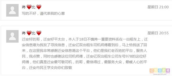 王先生说,特别感谢蔡师傅,他真是迁安最可敬的司机、的哥;也要感谢迁安信息港这个最信得过、最服务大众、最暖人心的平台。(编辑:李娜)